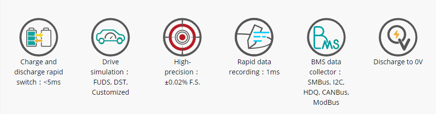 미국 Advanced Battery Consortium (USABC)의 Federal Urban Driving Schedule (FUDS) 및 Dynamic Stress Test (DST)와 같은 주요 국제 EV 테스트 표준은 드라이브 시뮬레이션 기능을 위해 내장되어 있습니다.